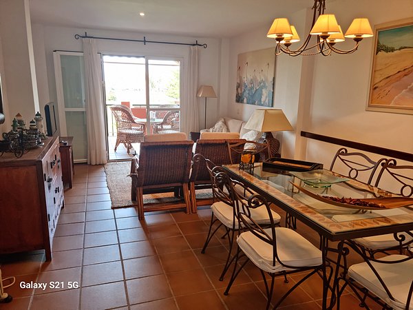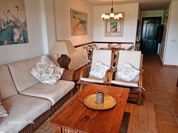 | Apartamento en primera lÃnea de playa, primer piso, a 5 minutos andando de la playa, con vistas al mar y al campo de golf. Consta de 2 dormitorios, 2 baños, cocina independiente, amplio salón comedor con terraza cubierta y toldo, en la terraza hay una mesa redonda de mimbre para poder comer con 4 butacones, toda llena de plantas y flores. |